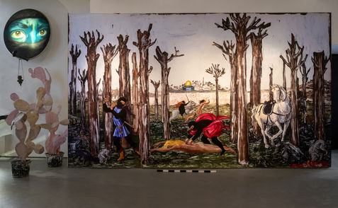 EN Tamar Hirschfeld’s video and installation works shift between the tragic and the comic and examine issues of gender and the politics of identity and post-colonialism. Over the past decade, Hirschfeld has adopted a nomadic persona, wandering around with a sense of disquiet, gazing at marginal areas and weakened populations. The exhibition features two major video installations from 2015–2019, screened within sculptural environments rich with materiality. The work screened on the ground floor is Sheldon the Humanist Skeleton )2015–2016(, depicting a fictitious affair between the artist, who was living in Lille, France, at the time, and a skeleton that she “discovered” in excavations in the Dead Sea area. It is an absurd love story between two foreigners in France, realized by puppeteers and the imagination—with a nod at the theatrical, cinematic and literary space. The complex and tangled reality of the refugee crisis, the Israeli–Palestinian conflict and the clash between nationalism and globalism is set out against the background of the rebirth of the humanist skeleton and the love story between Tamar and Sheldon, linking the personal- biographical with the historical, the political, the public. The work is screened in three sculptural environments that invite viewers to a journey through worldly, corporeal settings of a supermarket and a stalactite cave that culminate in an abysmal black space. The shift between environments in the film and the sculptural installation is linked with the perception of time in Hirschfeld’s work, articulating processes of change and renewal, a metamorphosis of the image from matter to spirit, from dead to living and vice versa. The entrance level features the video work The Cheese Butt [Chizbat or Tall Tale] )2017–2019(, viewed through a virtual-reality headset, in which three ancient worlds are juxtaposed with modern technology and global economy. The film narrates the tale of three Bedouin men stuck overnight in the desert with a broken-down car, who pass their time pleasantly around a fire with a thousand and one tales, until their car is miraculously revived. The escape from reality and the transition from the real to the imagined through the art of storytelling indirectly hint at the role of art in ongoing political crises. In the lower ground floor, one of Hirschfeld’s earlier works is screened, from the video installation Schwartze and a Brief History of Mankind )2013(, in which the artist, in the guise of a black woman, is talking to Yuval Noah Harari about his book. Schwartze was the first constitutive “mask” that defined Hirschfeld’s complex relationship between man and the world and between artist and society and replaced the focus on the individual and biographical with representation of humanity in its entirety. Through the principle of division and masking, the artist’s body signified the collapse of space and time between Africa and Europe and Israel, merged the traumas of various nations and reflected the moral dilemma regarding questions of contrition, correction )Tikkun( and atonement. The fluid, hybrid identity that the artist adopts in her works is linked with the grotesque body representations and the dialectics of crossing boundaries, characteristic of the carnivalesque. The components of carnival and grotesque are manifested in her work’s symbolic and esthetic stance: abundance and redundancy, mask and nudity, mechanisms of defamiliarization and reversal, crossing the lines between life and death, between body and soul, between sadness and laughter; all these expose the complexity of human existence as well as the false reality reflected through it. Hirschfeld presents life as a comedy and people as actors, tearing their masks off with curses while adopting the guise of the fool, happy and ridiculing, the scapegoat representing the sins of society, challenging the old order and motivating humanity towards catharsis, change, renewal and rebirth. In He Alone Stands Here )2018–2019(, the video that concludes the exhibition, the artist appears in a tragi-comic scene, hanging between heaven and earth from a date palm, accentuating her irrelevance to the reality which she represents, an eternal voyeur. Anat Danon Sivan